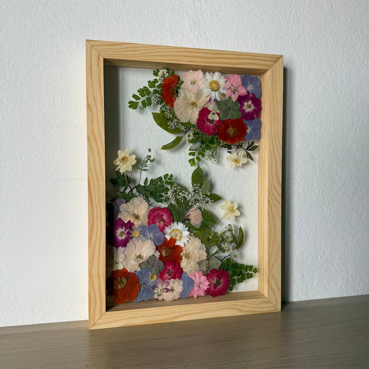 Květiny jsou zasazeny mezi skla a doplněny ručně vyráběným dřevěným rámem, který vzniká přímo v naší dílně. 🪵
