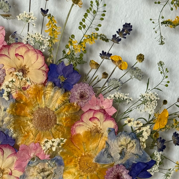 Použité květiny a rostliny jsou skutečné, ručně sbírané a šetrně lisované, aby si zachovaly svou přirozenou strukturu, jemnost i barevnost. 🌿 Následně jsou s citem aranžovány do jedinečné kompozice – každý obraz je originál, žádné dva kusy nejsou stejné.