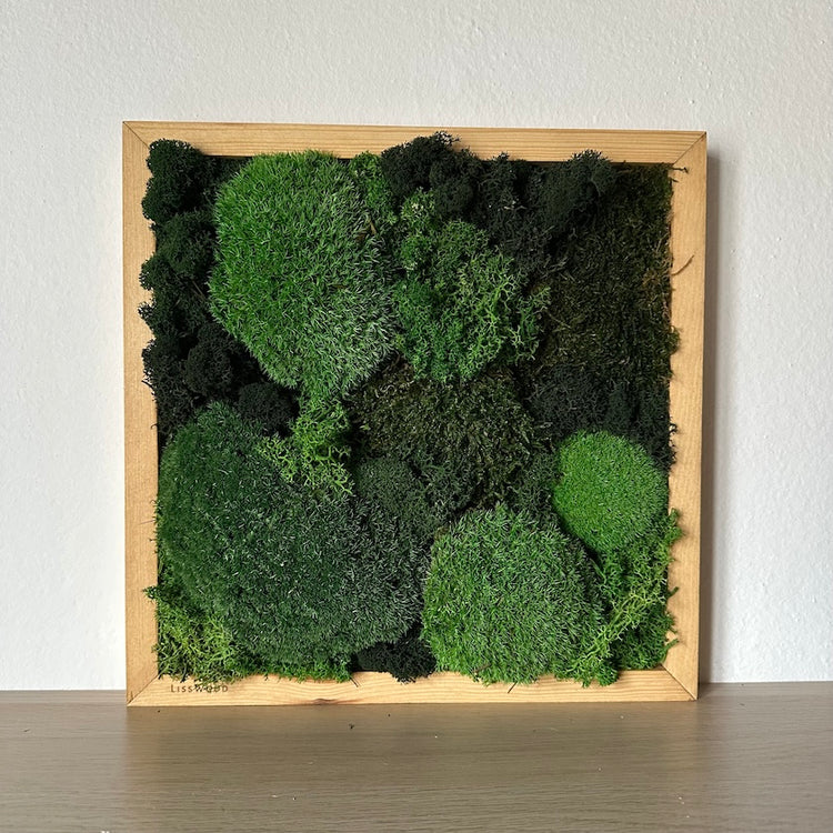 Ručně vyrobený obraz s nadýchanými chomáčky několika druhů mechu.