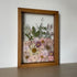 Květinový ručně vyrobený obraz s květy v růžových a bílých barvách, které rostou ze spodu obrazu. Mezi květy najdete ostrožky, květy třešní a mnoho dalšího.