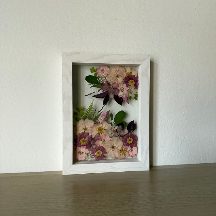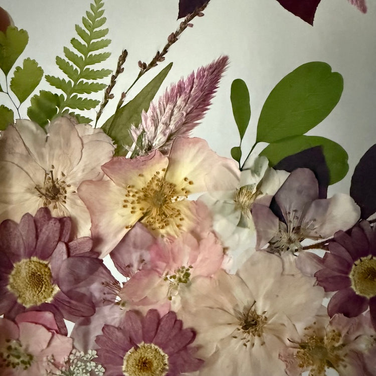 Květinový ručně vyrobený obraz s květy v růžových barvách, které rostou z rohů obrazu. Mezi květy najdete květy třešní, růži a mnoho dalšího.