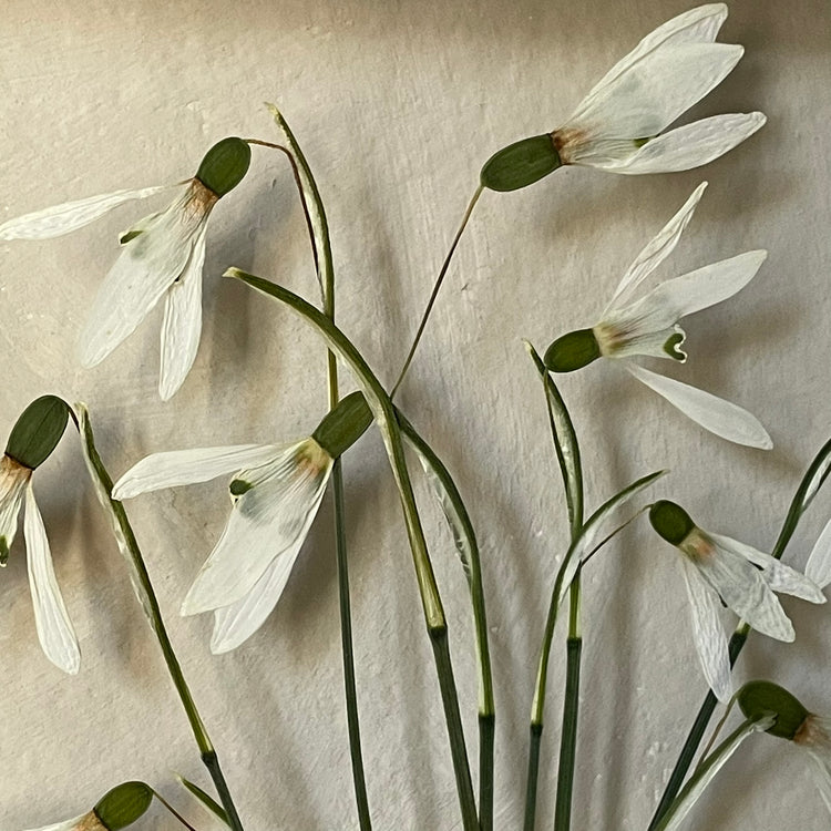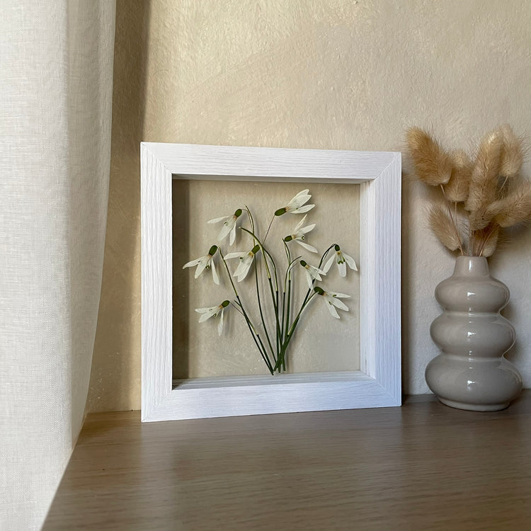 Květinový ručně vyrobený obraz s květy sněženek, které rostou ze středu obrazu.