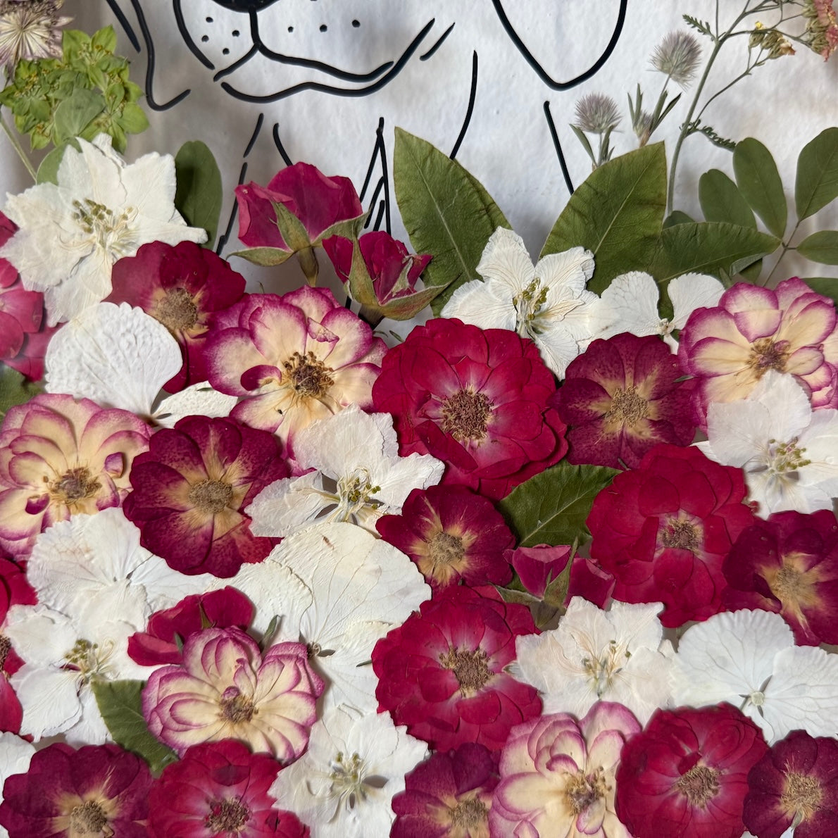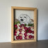 Květinový ručně vyrobený obraz s ručně nakreslenou siluetou zvířátka. Pejsek na rozkvetlé louce z pravých květů zahřeje u srdce každého milovníka zvířecí a květinové říše. Pro malé i velké.