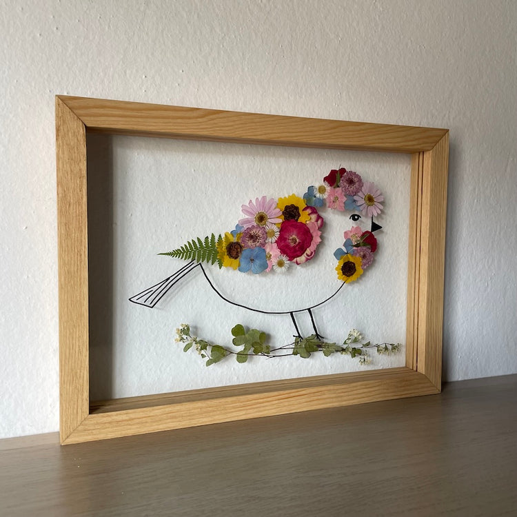 Květinový ručně vyrobený obraz s ručně nakreslenou siluetou zvířátka. Ptáček z pravých květů zahřeje u srdce každého milovníka zvířecí a květinové říše. Pro malé i velké.