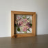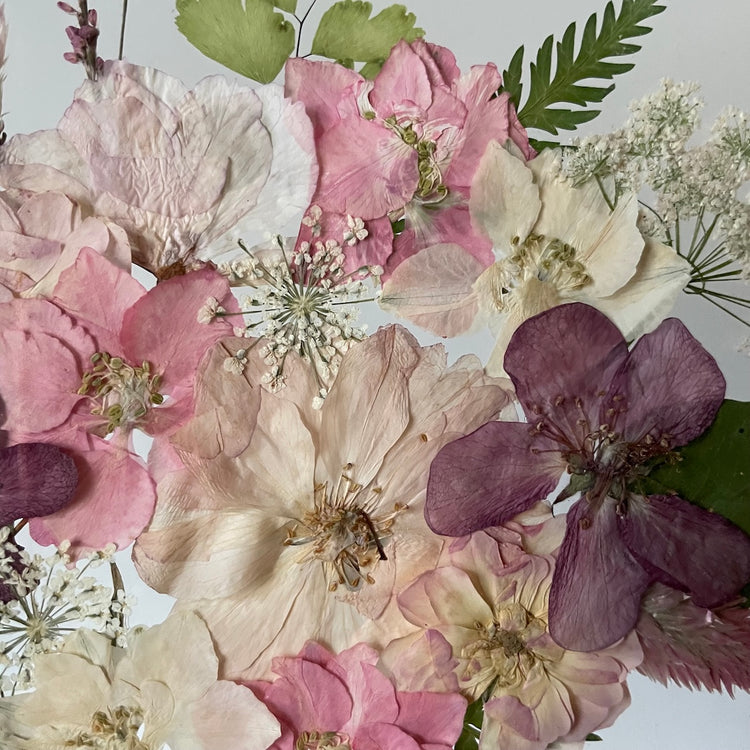 Květinový ručně vyrobený obraz s květy růžových barviček, které rostou ze středu obrazu. Mezi květy najdete ostrožky, květy třešní a mnoho dalšího.