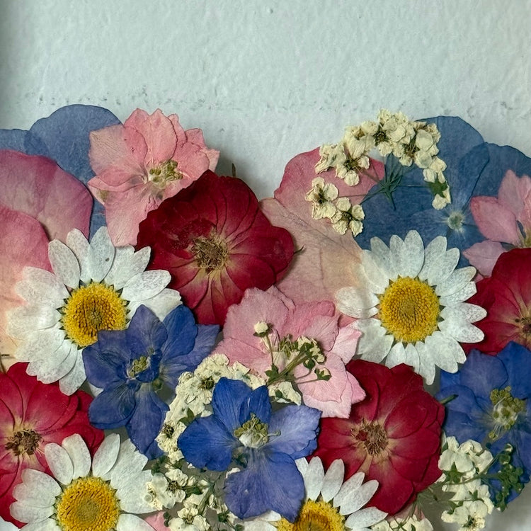 Květinový ručně vyrobený obraz s květy v červených, modrých a růžových barvách, které rostou do tvaru srdce. Mezi květy najdete růže, ostrožky, kopretiny a mnoho dalšího.