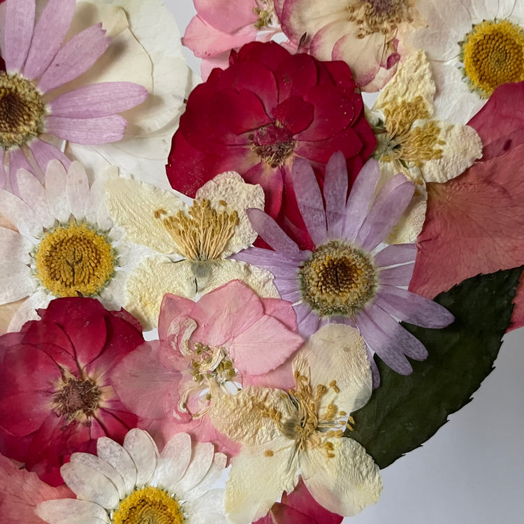Květinový ručně vyrobený obraz s květy v červených barvách, které rostou do tvaru srdce. Mezi květy najdete růže, ostrožky, kopretiny a mnoho dalšího.