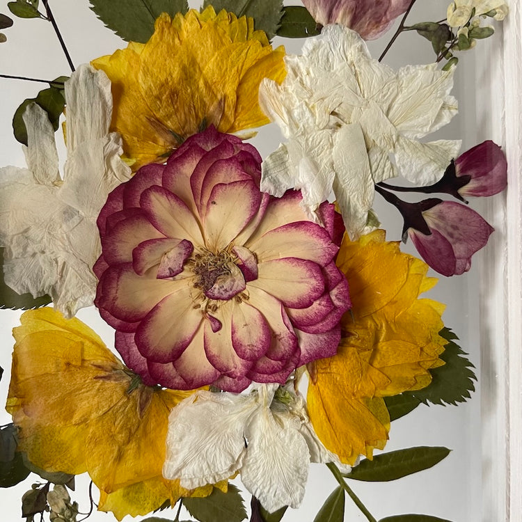 Květinový ručně vyrobený obraz s květy růžových, žlutých a bílých barev, které rostou ze středu obrazu. Mezi květy najdete ostrožky, růže a další.