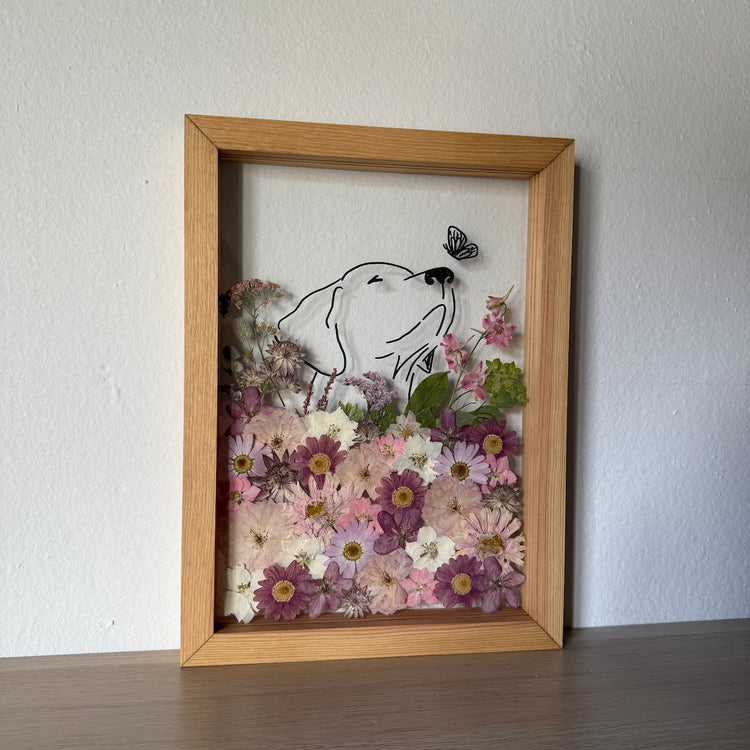 Květinový ručně vyrobený obraz s ručně nakreslenou siluetou zvířátka. Pejsek na rozkvetlé louce z pravých květů zahřeje u srdce každého milovníka zvířecí a květinové říše. Pro malé i velké.