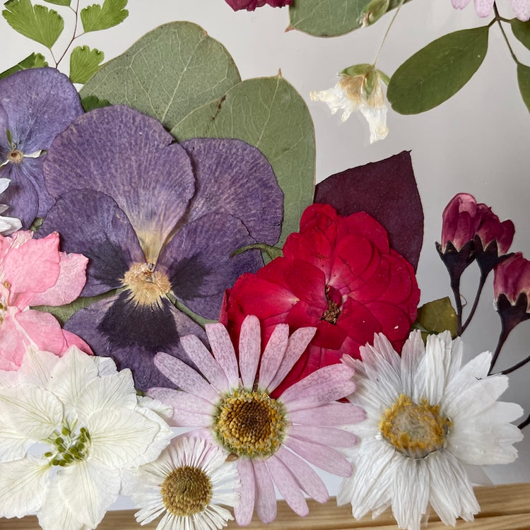 Květiny jsou zasazeny mezi skla a doplněny ručně vyráběným dřevěným rámem, který vzniká přímo v naší dílně. 🪵