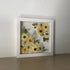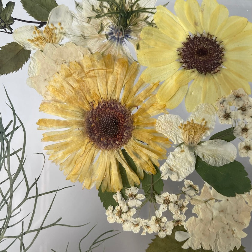 Květinový ručně vyrobený obraz s květy ve žlutých a bílých barvách, které rostou z rohů obrazu. Mezi květy najdete měsíčky, jasmín a mnoho dalšího.