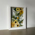 Květinový ručně vyrobený obraz s květy v bílých a žlutých barvách, které rostou z rohů obrazu. Mezi květy najdete květy měsíčku, ostrožky, pryskyřníků a mnoho dalšího.
