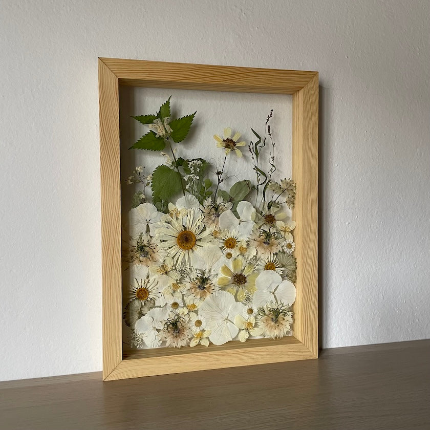 Květinový ručně vyrobený obraz s květy v bílých barvách, které rostou ze spodu obrazu. Mezi květy najdete hortenzie, černuchy, kopretiny a mnoho dalšího.
