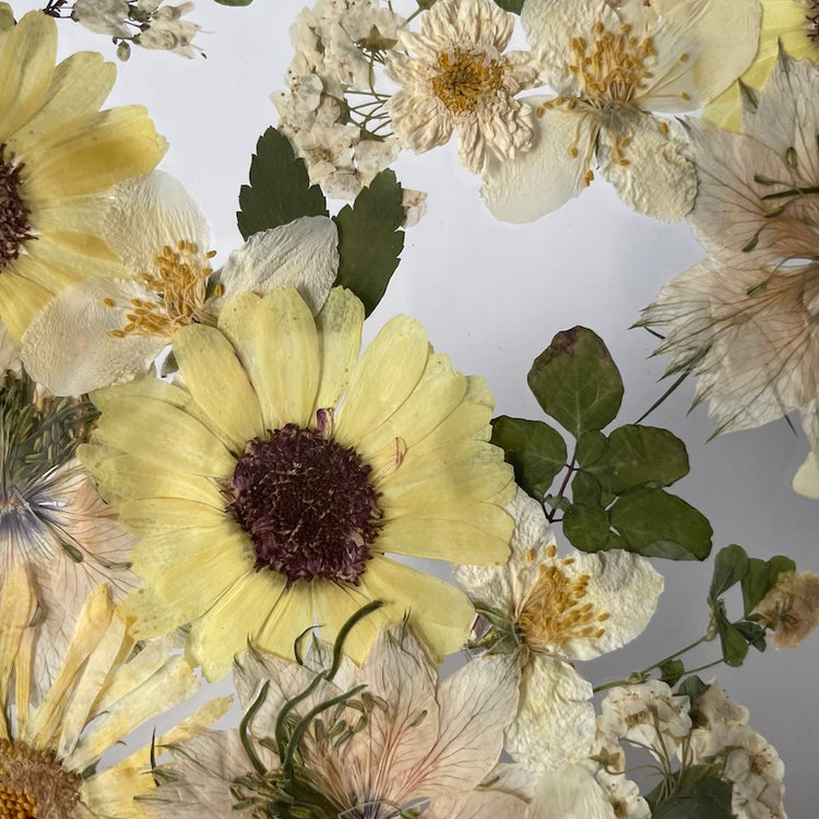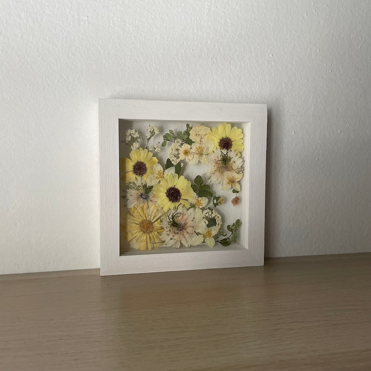 Květinový ručně vyrobený obraz s květy žlutých a bílých barviček, které rostou z rohů obrazu. Mezi květy najdete černuchy, měsíčky, jasmín a mnoho dalšího.