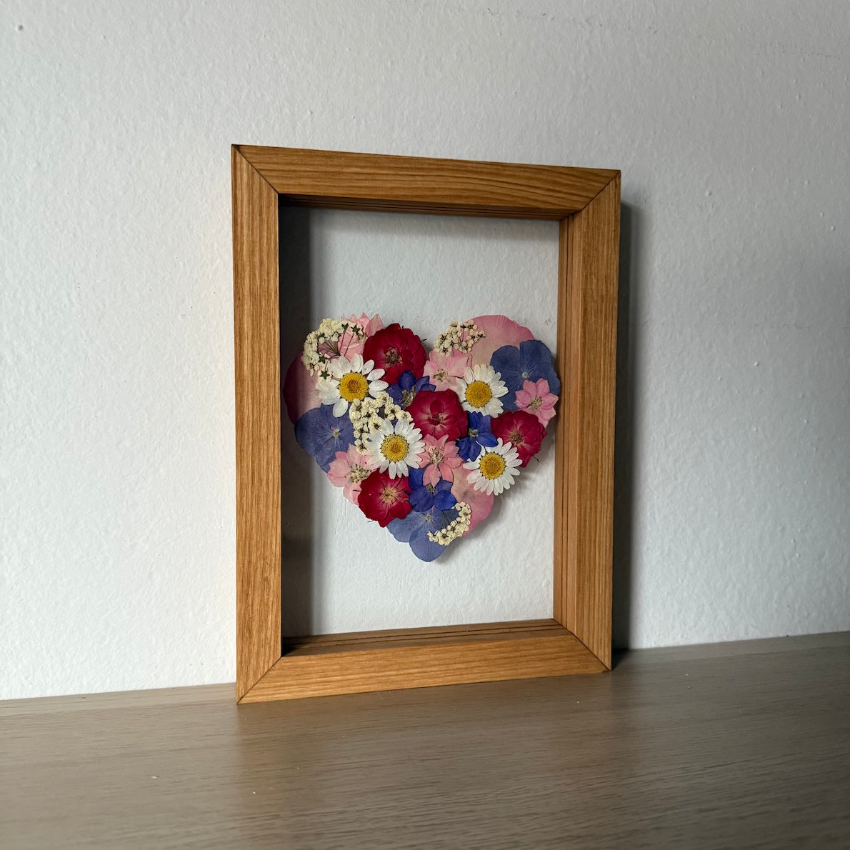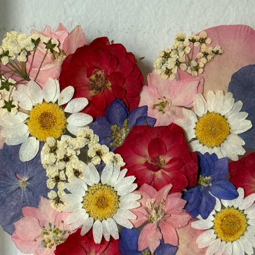Květinový ručně vyrobený obraz s květy v červených, modrých a růžových barvách, které rostou do tvaru srdce. Mezi květy najdete růže, ostrožky, kopretiny a mnoho dalšího.