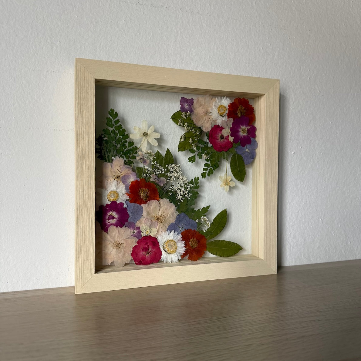 Květiny jsou zasazeny mezi skla a doplněny ručně vyráběným dřevěným rámem, který vzniká přímo v naší dílně. 🪵