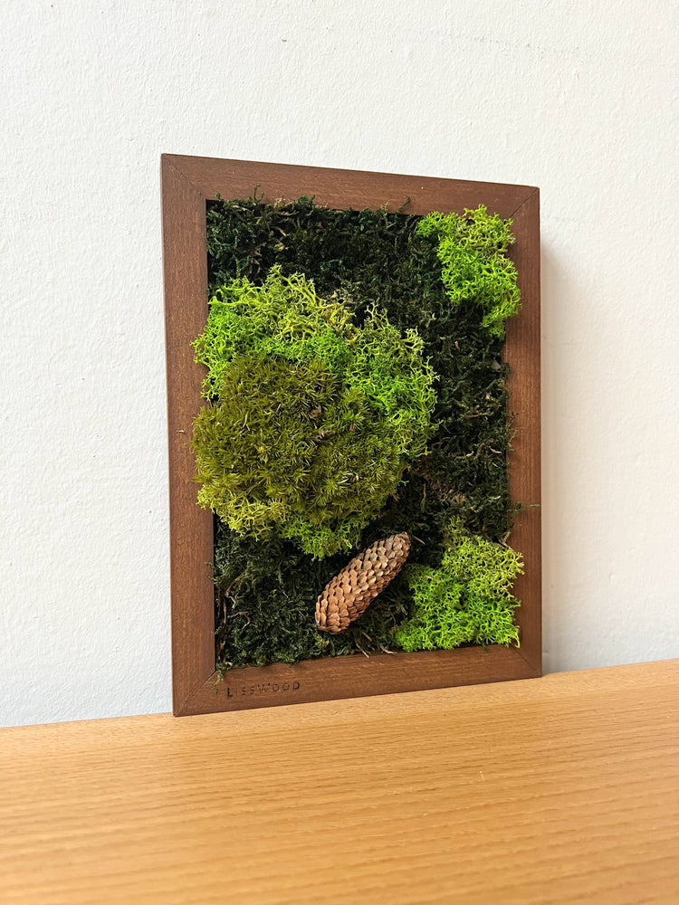 Ručně vyrobený obraz s nadýchanými chomáčky několika druhů mechu.