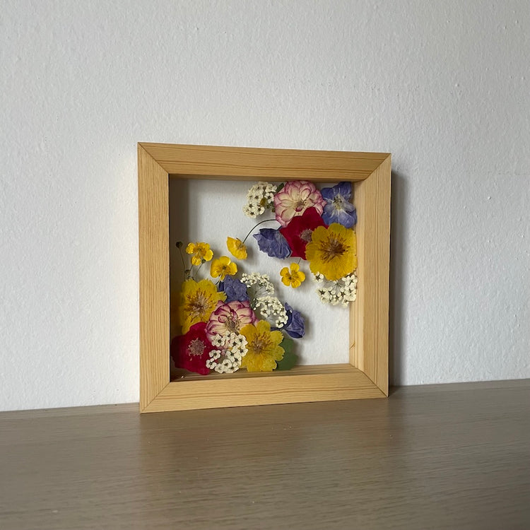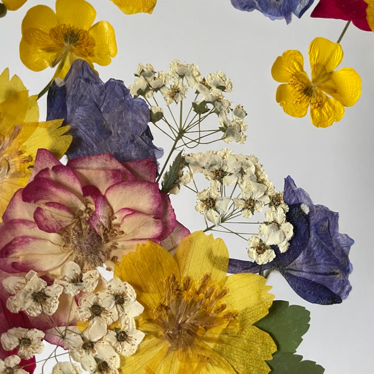 Květinový ručně vyrobený obraz s květy červených, modrých a žlutých barviček, které rostou z rohů obrazu. Mezi květy najdete pryskyřníky, růže a mnoho dalšího.