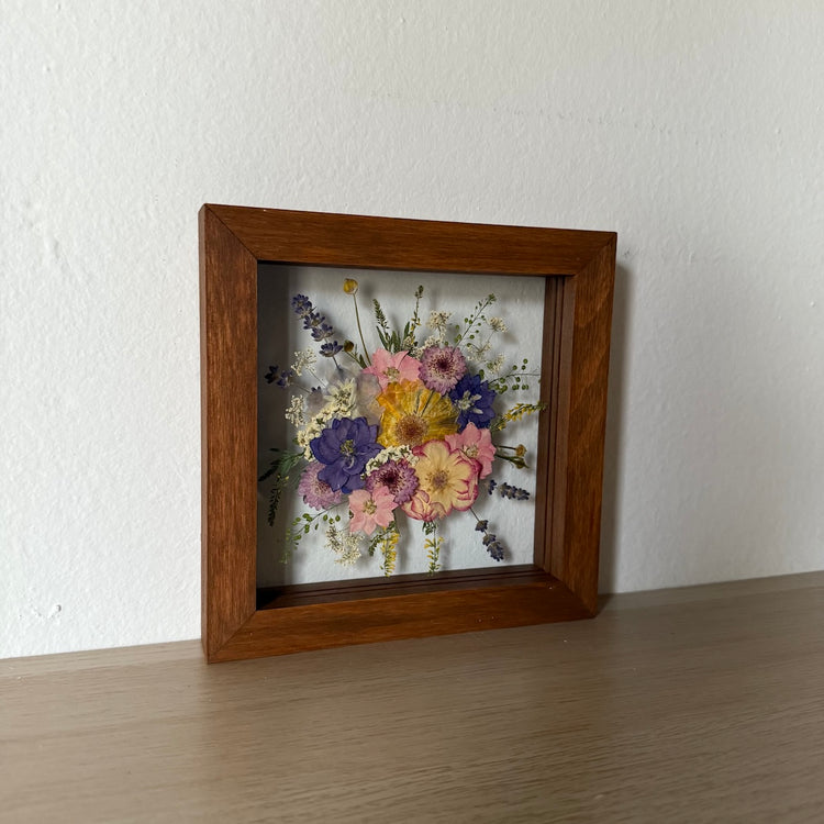 Květiny jsou zasazeny mezi skla a doplněny ručně vyráběným dřevěným rámem, který vzniká přímo v naší dílně. 🪵