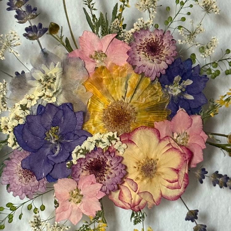 Použité květiny a rostliny jsou skutečné, ručně sbírané a šetrně lisované, aby si zachovaly svou přirozenou strukturu, jemnost i barevnost. 🌿 Následně jsou s citem aranžovány do jedinečné kompozice – každý obraz je originál, žádné dva kusy nejsou stejné.