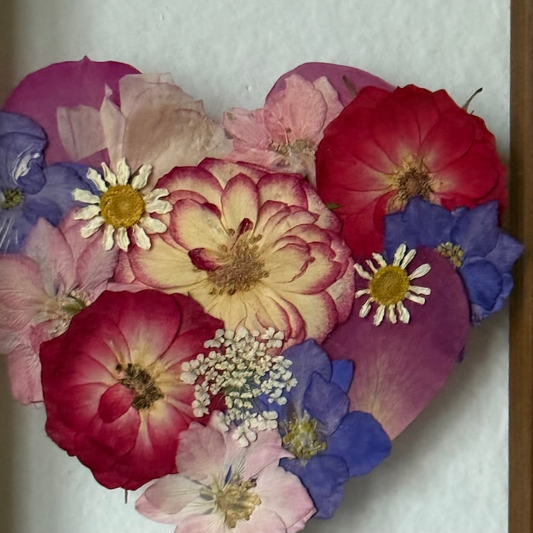 Květinový ručně vyrobený obraz s květy modrých, růžových a červených barviček, které rostou ve tvaru srdce ze středu obrazu. Mezi květy najdete růže, ostrožky a mnoho dalšího.