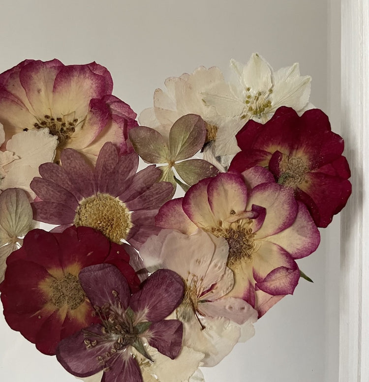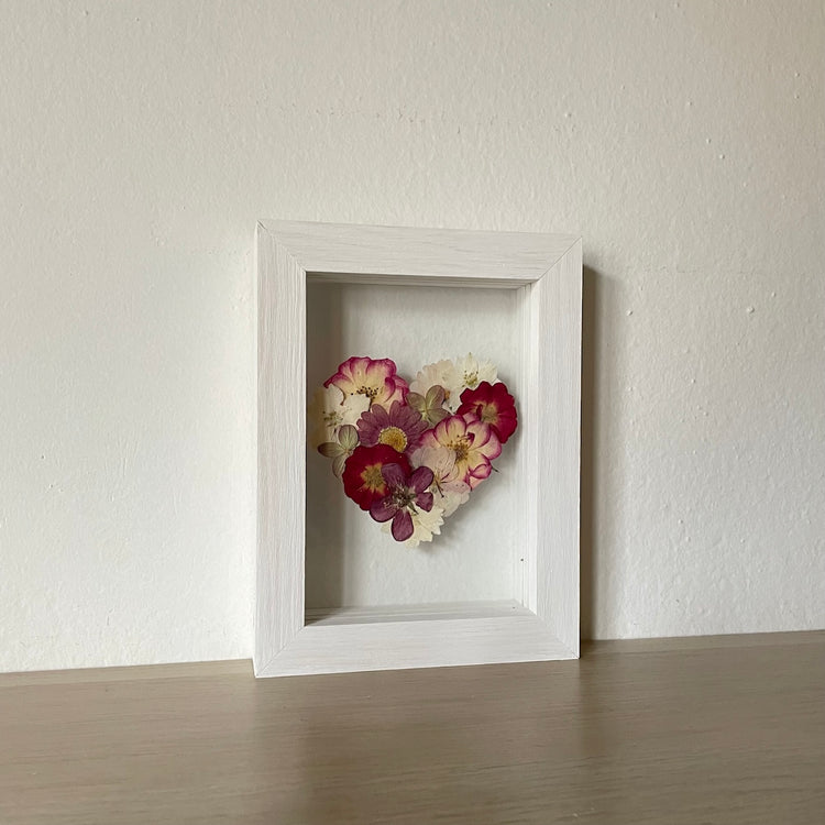 Květinový ručně vyrobený obraz s květy bílých, růžových a červených barviček, které rostou ve tvaru srdce ze středu obrazu. Mezi květy najdete květy třešní, růže, ostrožky a mnoho dalšího.