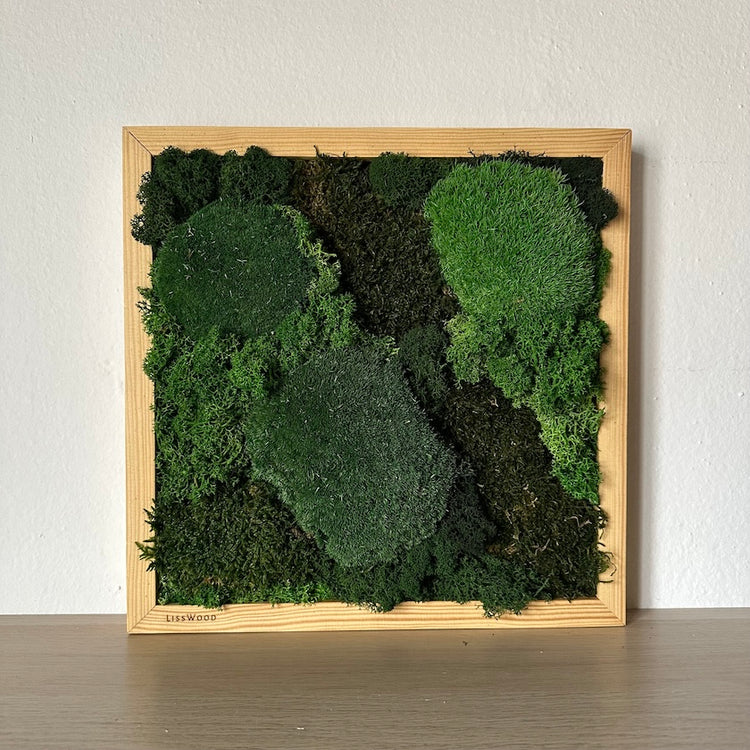 Ručně vyrobený obraz s nadýchanými chomáčky několika druhů mechu.
