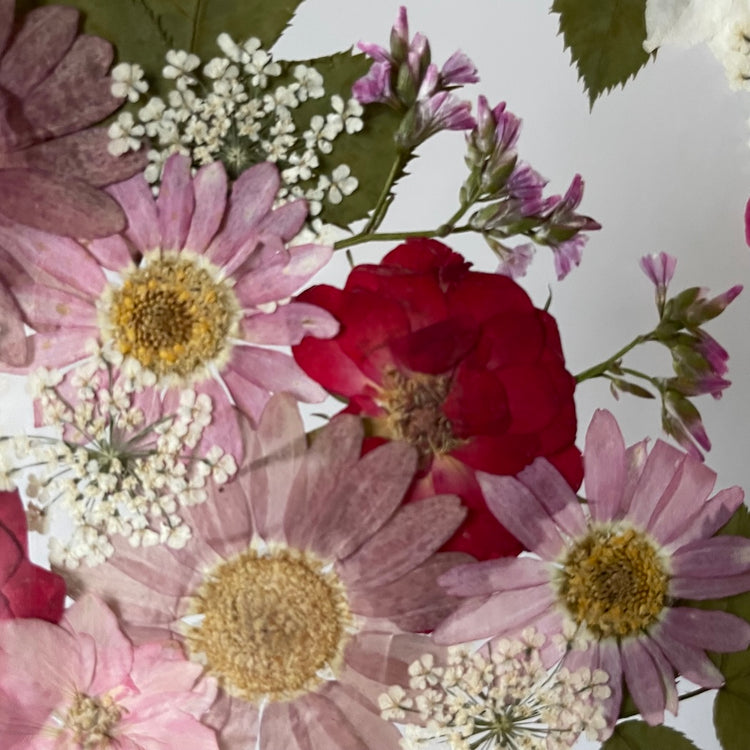 Květinový ručně vyrobený obraz s květy v růžových, bílých a červených barvách, které rostou z rohů obrazu. Mezi květy najdete ostrožky, růže a mnoho dalšího.