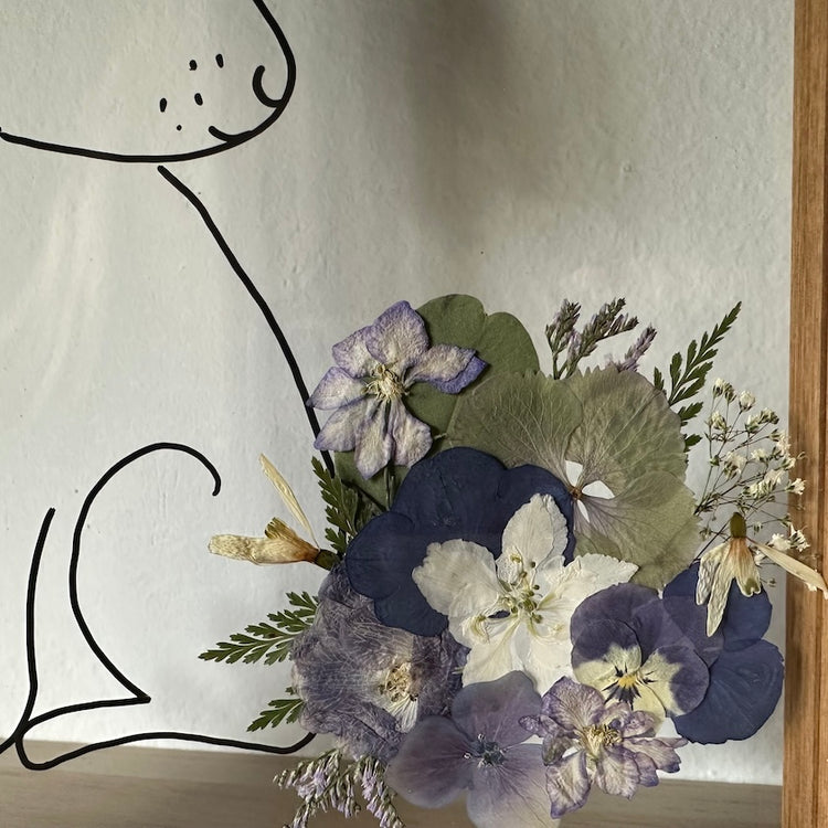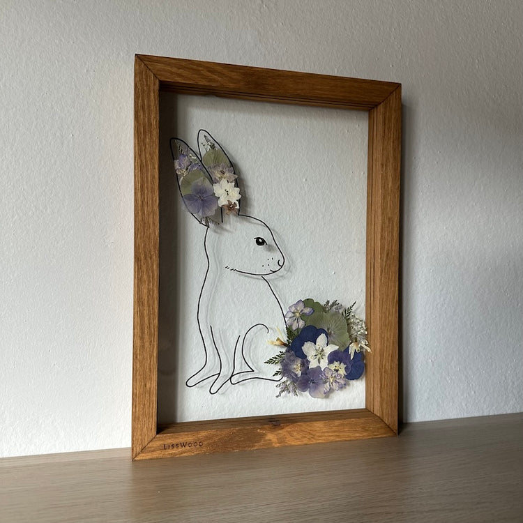 Květinový ručně vyrobený obraz s ručně nakreslenou siluetou zvířátka. Zajíc s rozkvetlým ocasem a ušima z pravých květů zahřeje u srdce každého milovníka zvířecí a květinové říše. Pro malé i velké.