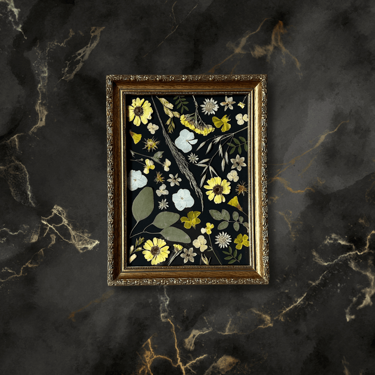 Květinový ručně vyrobený obraz je zarámovaný do starého rámu na černém podkladu.